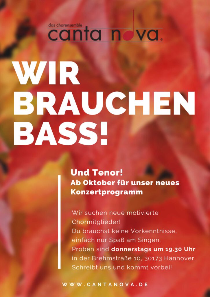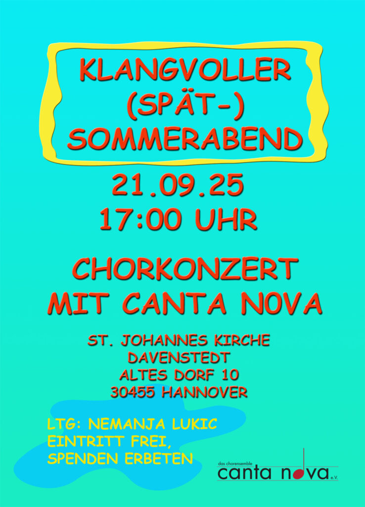 Am 21. September kann man uns um 17.00 Uhr in der St. Johannes Kirche in Davenstedt hören. Freut Euch auf ein Konzert mit bekannten und unbekannten Stücken.