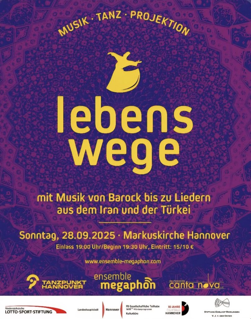Unter dem Titel „Lebenswege“ lädt das Ensemble Megaphon zu einem interkulturellen Konzert ein, das verschiedene Kulturen, Epochen und Kunstformen miteinander verbindet. Gemeinsam mit Musiker:innen aus dem Iran, Syrien und der Türkei sowie Tänzer:innen und Canta Nova gestaltet das Ensemble Megaphon ein vielschichtiges Programm, in dem Werke des Barock, traditionelle Lieder und Improvisationen miteinander verwoben werden. Künstler:innen aus verschiedenen Ländern begegnen sich, inspiriert durch das Zitat des großen Mystikers Rumi: